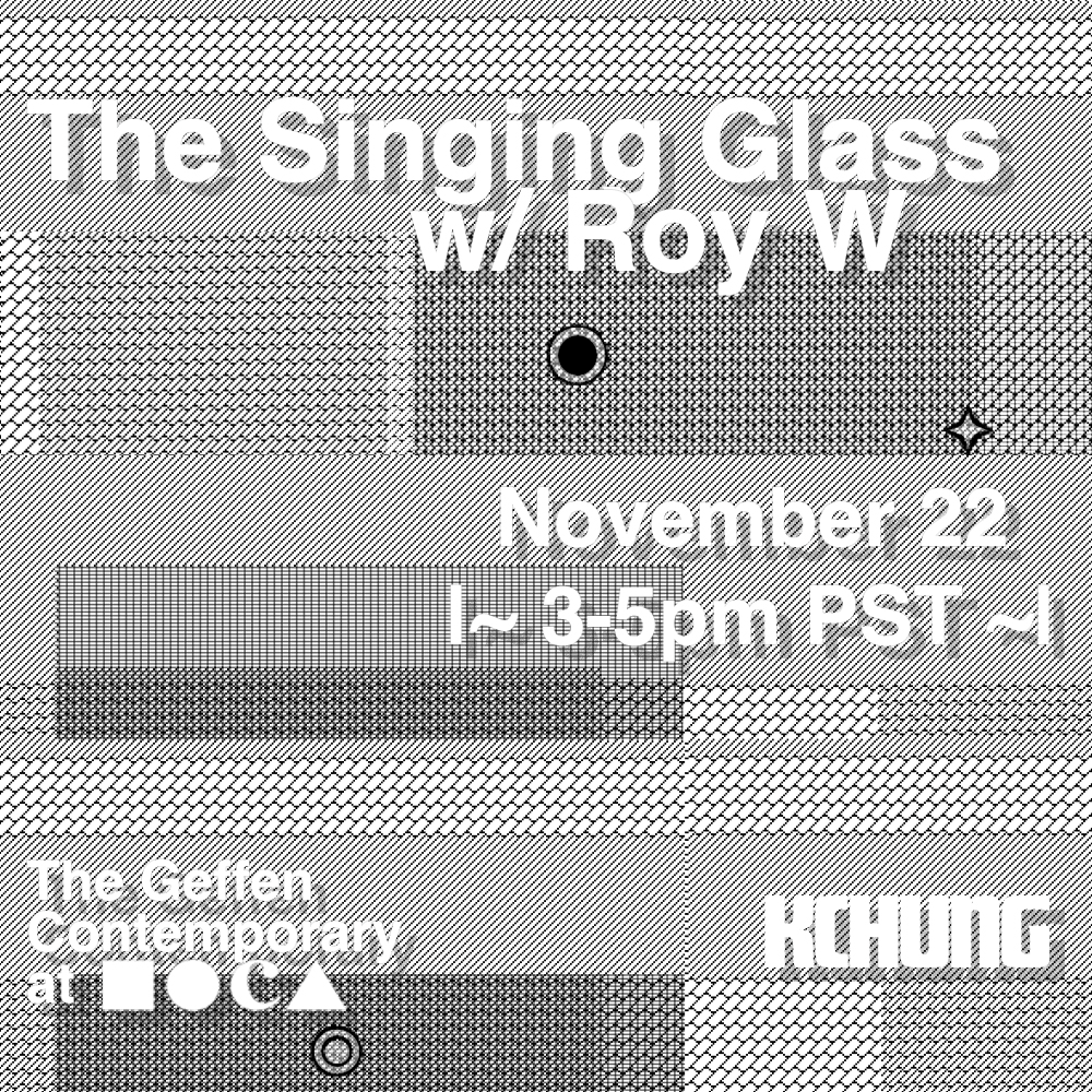 Ongoing monthly radio program broadcast on KCHUNG Radio live from MOCA Geffen in Little Tokyo, Los Angeles. The Singing Glass investigates contemporary electronic moods and the various sonic zones surrounding - a fragile mosaic DJ mix - featuring (intermittently) an episodic piece of the same name pairing new music by Roy Werner + recited work by Mac Katter - an interlaced surrealist narrative concerning those working on a corn farm and musings on weather.